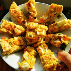煎熟,切块,装盘开吃啦
