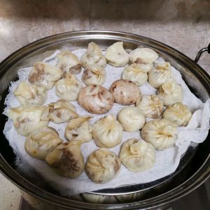 冷水蒸包子,水开之后中火,开始算时间,十分钟。不要马上开盖子。关火焖五分钟再打开。