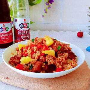 八成熟时下入米饭一起翻炒,直至米饭充分吸收油脂,下入菠萝丁翻炒两分钟,加入盐、糖、味精调味,即可关火盛出。
