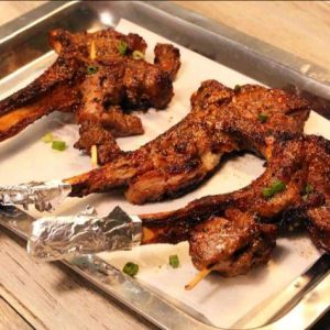 4把腌制好的羊排摆在烤盘上,撒上芝麻,黑胡椒粉,孜然。