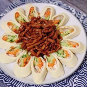 将葱丝、黄瓜、胡萝卜放在豆皮上卷起来,卷的紧一点