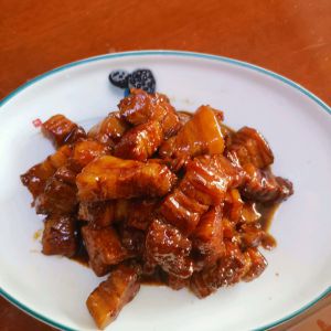 五花肉冷水入锅,加入水,放入姜片葱段,料酒,大火煮开撇去浮沫,盛出备用