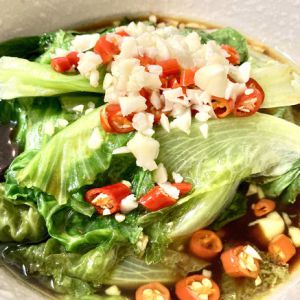 烧一锅水,水开后加入一小勺食盐,滴几滴食用油,下清洗好的生菜,烫10秒后捞起。
