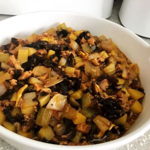 加入土豆丁、洋葱丁、香菇云耳丁,料汁、姜片蒜片一起中小火焖