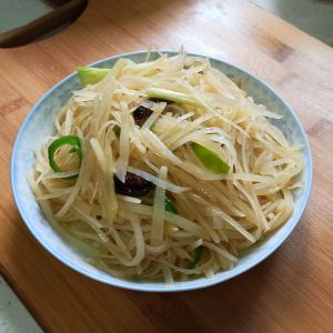 然后开大火,倒入土豆丝,翻炒几下即可,放入盐,放入糖,再倒入醋,继续翻炒。炒到土豆丝上的水汽没有了,看到出现发粘,紧接下入青椒丝和葱段,炒几下即可关火装盘。