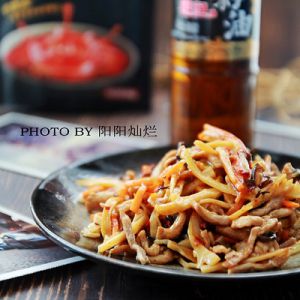 炒出香味后再放入木耳丝、胡萝卜丝、笋丝炒匀。