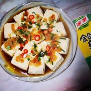 臭豆腐摆盘,把家乐金剁椒酱,蒜末倒在臭豆腐上,撒一些生抽