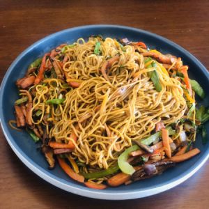 大火翻炒火腿、青椒、胡萝卜以免水分太多,炒出的面太湿不好吃。葱叶最后再放。