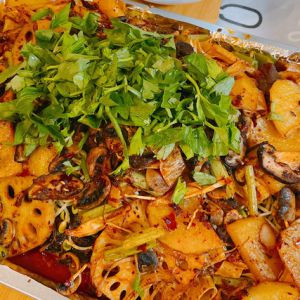 配菜制作方法:各种蔬菜切好,焯水断生捞出备用。热锅下油,放葱姜蒜炒香,加入麻辣香锅底料翻炒,加入蔬菜继续,一两分钟后把炒制的配菜均匀铺在烤鱼上,最好撒一些汤汁。