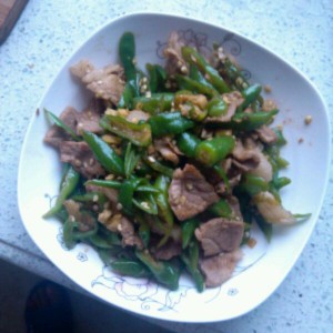 肉片加蒜蓉先下锅,至六成熟加入青椒爆熟即可