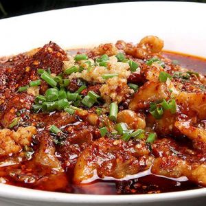 起锅烧油,肉片上面放花椒粉,辣椒面,蒜末,葱花和花椒粒,油温七成热淋在上面即可,最后可以撒上点熟芝麻。这样水煮肉片就做好了