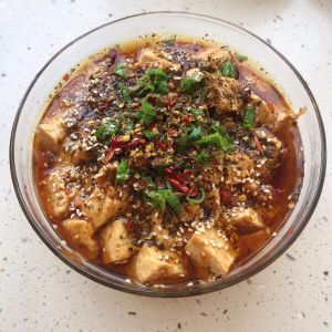 把香葱碎、花椒碎、辣椒籽儿、芝麻撒在豆腐上