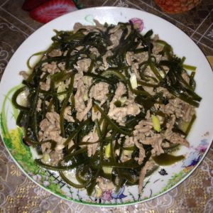 加入葱蒜末翻炒几下,加入海带继续翻炒,可加入少量水焖一会,加入少量盐,鸡精炒匀起锅。