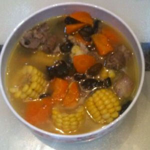 排骨焯去血水;胡萝卜去皮,滚刀切。玉米切成五、六断。