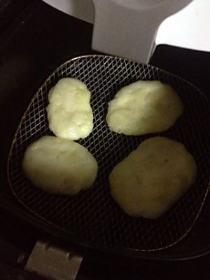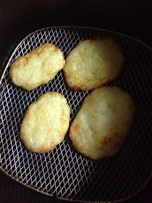空气炸锅做法:土豆饼两面刷上一层油后放入已预热的空气炸锅以180度烘烤15分钟即成,之间可以翻一次面。喜欢焦一点适当增加烘烤时间。