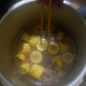 玉米切片,排骨切块,加入酱油,盐,味精。放入高压锅,上气后,压个20分钟。