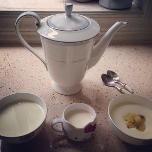 冲入牛奶后,千万不能移动碗,让其静至5分钟左右,姜汁撞奶就凝固好了。