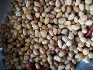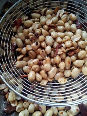 第四步就是捞花生出锅,迅速捞出沥干油盛入器皿中。