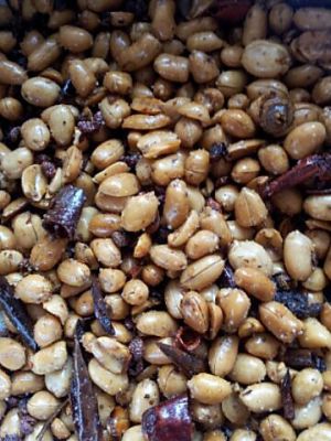 最后就是将盛花生的器皿浸泡在冷水中,并根据自己口味调入糖、盐和辣椒面(我这里用的是老公从贵州带回来的特产),快速拌匀直到完全没有热气。