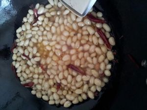 第三步就是炸花生啦~锅里倒入油,加入花椒和干辣椒(剪碎),开中火煸炒出香味,将花生投入煸炒一分钟后倒入适量老白干,继续翻炒直到花生变色,酒味淡去。