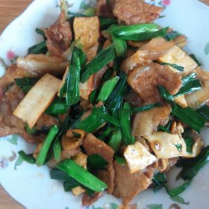 这步没照片就口述吧1.锅热了,倒少许油,把肥肉先下锅炒出油,然后再放瘦肉炒一会儿,待肉炒到有点发黄微卷之后加入甜面酱炒两下,接着把蒜苗,豆干倒入锅中加入适量的精盐,味精,鳮精,酱油翻炒一会儿。好了,就可以出锅装盘了。