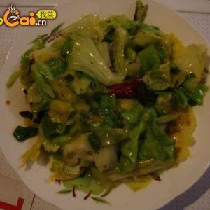 慢慢让香味挥发出来,稍微变色放入葱花爆香,倒入撕好的包菜,翻炒2分钟,放少许盐,鸡精,成盘。
