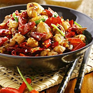 在锅中留底油,大火烧热,放入葱片、姜片爆香,随后放入辣椒段和麻椒,翻炒出麻辣香味,然后放入炸好的鸡块翻炒,最后撒入鸡精、白糖和葱段炒匀起过即可。喜欢的撒上些熟白芝麻,味道会更香。