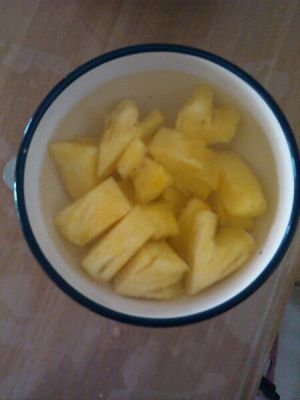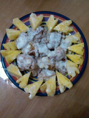 用酸奶和沙拉酱调成汁,放入炸好的油条和浸好的菠萝拌均匀,装盘。