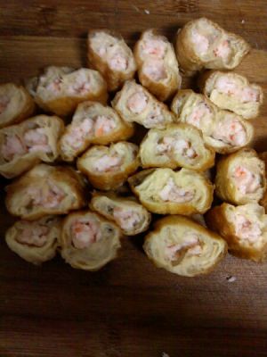 油条一分为二,切成2-3厘米小段,用筷子捅出小洞,塞入去了姜的虾泥。入油锅炸脆。