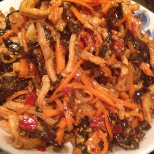 热油放葱末,倒入泡辣椒,翻炒片刻,加入肉丝翻炒至9成熟,然后再倒入木耳、胡萝卜拌匀2分钟后,出锅;