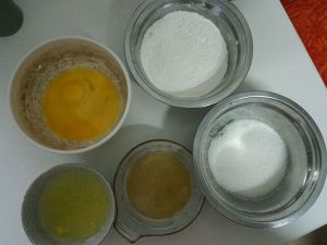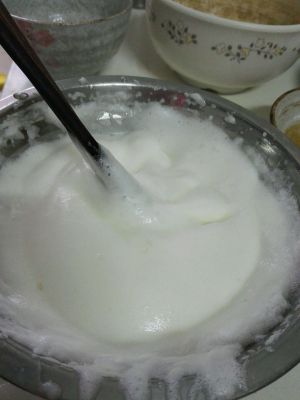 蛋清和蛋黄分离,用电动搅拌器打到成奶油状,中间加入一勺白糖