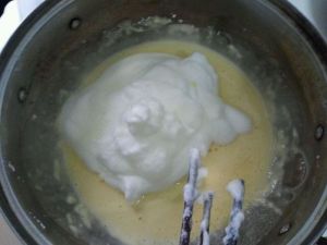 蛋黄加入1小杯牛奶,两勺白糖,备用蜂蜜!搅拌好,再加入打好的蛋清,左右上下搅拌好,切记这个加入蛋清后的步骤不要打圈!