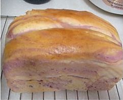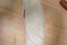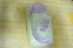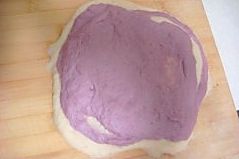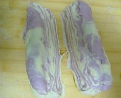 取一白面团和一个紫薯面团擀成面片,白面片在下面,上面放紫薯面片。