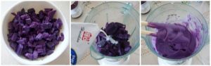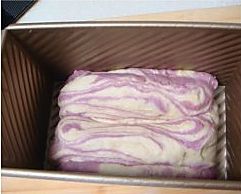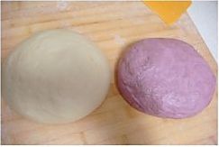 后油法分别用面包机揉出一饿白面团和紫薯面团,进行第一次发酵至两倍大。