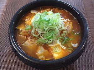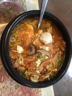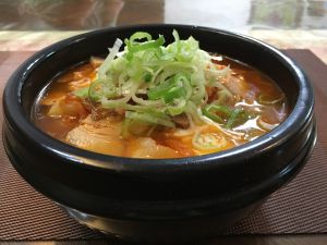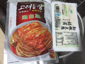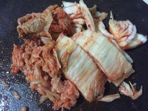 热油锅放入蒜片爆香,放入辣白菜翻炒。