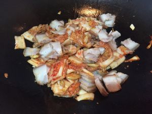 放入切薄片的五花肉再翻炒,倒入泡菜袋里的浓汁。