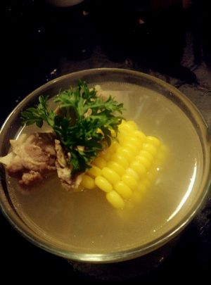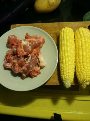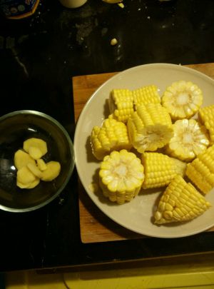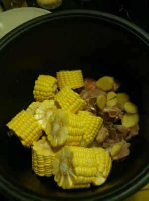 玉米,姜,骨头一起放入电饭煲里,加入适量的清水盖上盖子