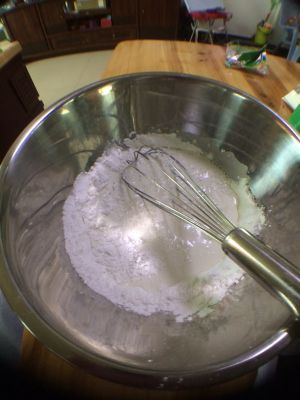 先制作冰皮,将所有粉类倒入一个大碗里,再加入牛奶,用手动打蛋器混合均匀(无颗粒状)再加入玉米油和炼奶继续混合均匀