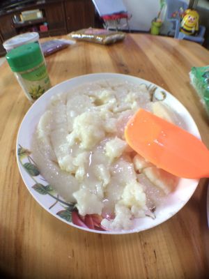 冰皮面糊蒸好后,先用筷子划成一块块,蒸碗边的面糊趁热用刮刀刮起来,(这时候的面糊看上去比较粗糙,没有关系,等一下将玉米油揉入面糊里就变光滑了)