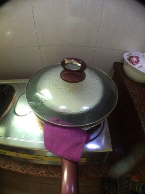 将混合好的冰皮面糊倒入蒸碗里,上锅大火隔水蒸25分钟(蒸的过程中用锅盖夹着一块补,让锅盖稍稍倾斜,防止蒸汽的水倒流进面糊里)