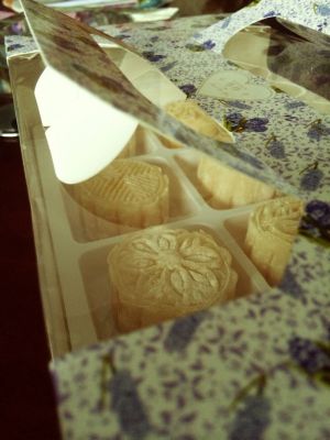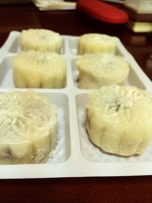 冰皮搓圆按扁,按至原来的两倍大小,放入搓圆的奶黄馅,将奶黄馅包起来,包好后抹上一点糕粉,放进月饼模具里,用力按压出月饼形状
