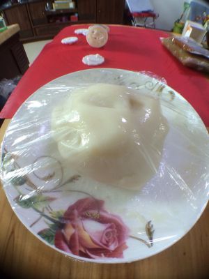 冰皮面糊稍稍放凉,然后带上手套揉面团至光滑,揉好后用保鲜膜盖住,冷却到室温
