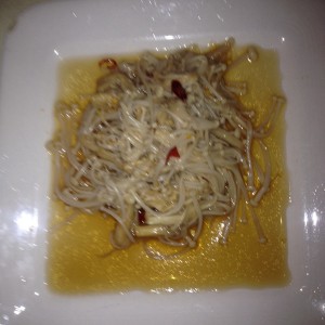 然后加盐,味精,酱油,香油,和辣椒段调好汁,浇在之前抄好的金针菇上就可以了