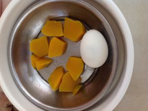 将南瓜去皮和咸蛋洗净后放在电饭煲上,提前煲饭的时候蒸熟