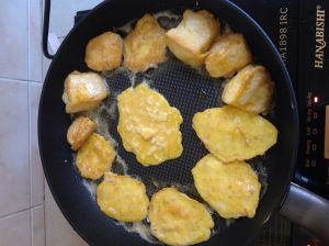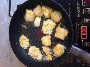 我的豆腐就没扣好,所以只有几块是大块的其余都碎了,而且粘淀粉和裹蛋液的时候手一定要轻,不然也是很容易碎,不象大饭店做那么容易喔,人家可是专业的。