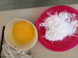 准备好淀粉和鸡蛋液放在锅旁待用