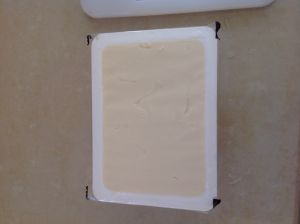先将盒装豆腐整个扣出来,能扣完整一点也不容易喔。