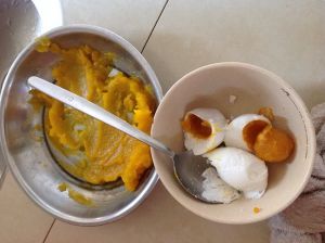 蒸熟后取出来,混合在一起加适量凉白开捣鼓成咸蛋南瓜酱