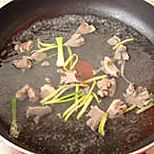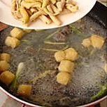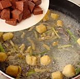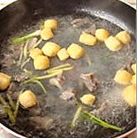 锅入油,将葱段,姜丝爆香,加入高汤一碗煮沸,先将鸭胗放入。