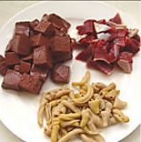 先将鸭血切成1.5厘米小块,放入盐水中浸泡片刻;鸭胗切花刀,鸭肠将里面的油脂刮干净,加适量盐揉洗干净,放入水中汆烫,鸭肠卷起就马上捞出。